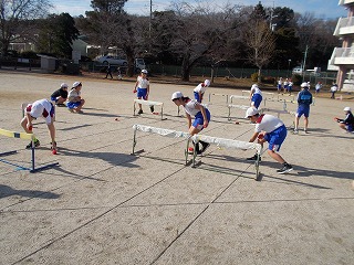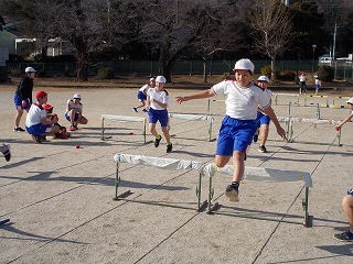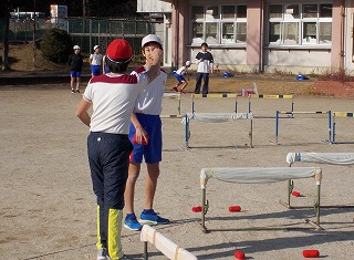 陸上大会で活躍した児童に跳んでてもらい、踏切と着地の位置を確認して、お手玉を置きます。「ハードルから少し離れた位置で踏み切ること」を確認したら、順番に跳んでいきます。待機していた他の児童が、先ほどと同様にお手玉を置き、児童は自分で位置を確認します。