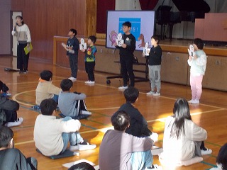 計画委員の児童が、進行をします。まずは、計画委員より「人権について」の話がありました。次に、各学級が考えた「誓いの言葉」を発表しました。そこには、一人一人の取り組みも貼っています。人権について、全校児童全員が考えた証です。最後に、「すてきな友達」を歌いました。「歌詞のように、人は一人では生きてゆけないから、友達を大切にしましょう。」という計画委員の言葉で、集会を閉じました。