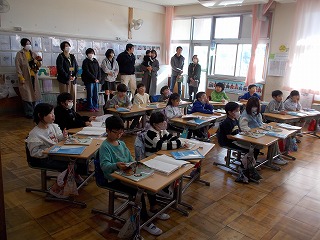 「お母さん、来るかな?」と昇降口まで見に行っていた1年生。授業が始まる5分前には、まだ階段の辺りをうろうろしていましたが、始まりの挨拶前には全員着席できたようです。お家の方に見守られ、とても嬉しそうです。