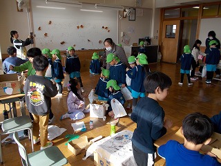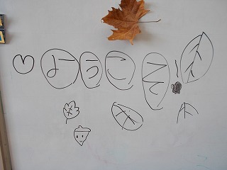 1年生が生活科の学習で集めたどんぐりや落ち葉など秋の自然を使って遊びを考えました。今日は、ひまわりこども園の年長さんを招待して遊んでもらいました。
