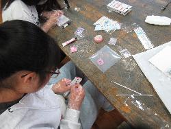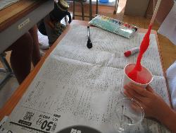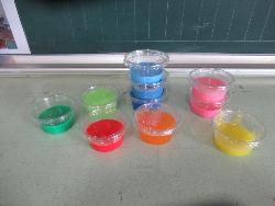 なしのみ学級の児童がスライム作りをしていました。「水を測って持ってきて」と言われ、目盛りのついた容器に慎重に水を測り、カップに入れます。そしてそこに絵の具を入れ、練ります。だんだんと粘り気のあるスライムができてきます。みるみるうちに色とりどりのスライムができあがりました。