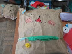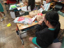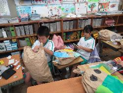 2年生が図工の授業で、「ぎゅっとしたい わたしのお友だち」という作品を作っていました。紙袋に新聞を入れ、リボンやモールなどで飾り付けたり、絵を描いたりして、おしゃれな友達を作っていました。なんとなく微笑ましい光景でした。