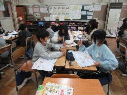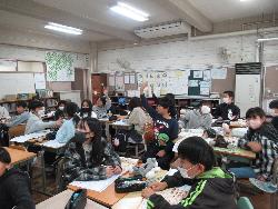5年生は、来週の調理実習に向けて準備を進めていました。メニューは「みそ汁」です。「どんな具材を入れる?」という問いかけに、「白菜、なめこ、油揚げ、大根、ねぎ、にら、肉」など、さまざまな具材の名前が挙がります。そして、実際どんな組み合わせで作るか班ごとに話し合います。来週の調理実習に向けて心が躍ります。