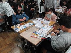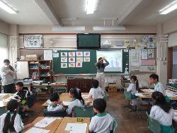 1年生が、ALTと楽しそうに英語を使ったゲームをしていました。じゃんけんをして、勝つと自分が描いた果物を英語で紹介します。語学の習得にはまずはその言語に親しむことです。ゲームを通して、その言語に興味を持ち、もっと学びたいという動機付けになればと思います。