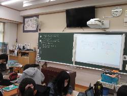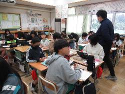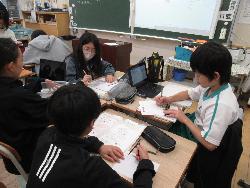 6年生の算数では、「四角形の拡大図はどのようにかけばよいだろうか」という学習問題に取り組んでいました。コンパスや分度器を使って拡大図を書き、それをタブレットで写して全体で共有します。「拡大図はどうやってかくの?」と質問すると、丁寧にやり方を教えてくれました。自分の考えを言葉で表す、大切な取組です。