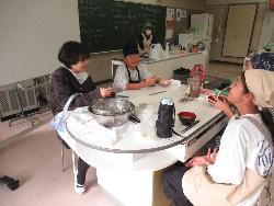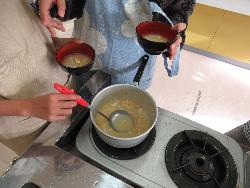 今日は5年生が「みそ汁」作りに取り組んでいました。初めてみそ汁を作る子も多く、具材の大根が煮えるのを待つ間も、手持ち無沙汰に鍋をかき回します。「そんなにまぜなくて大丈夫」という声も聞かれます。ようやくみそを入れる時にも、みそをどうするか考えます。「よく溶いて、汁の中に入れるんだよ」というアドバイスにおっかなびっくりみそを鍋に入れていきます。盛り付けをしていざ試食です。「おいしい」という声が聞こえてきました。今日の5年生の調理実習、無事終了です。