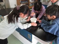 5年生は理科の授業で、「食塩やミョウバンは水にどれだけとけるだろうか」という学習問題に取り組んでいました。課題に向けて、実験開始です。5グラム刻みに食塩やミョウバンを水に加えていき、それが溶けるかどうか確認します。入れる物質の量が増えていくと、溶けなくなっていきます。「なぜ溶けないんだろう」この疑問から新たな学びが始まります。