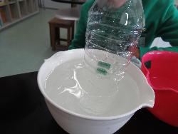 4年生が「ものの温度と体積」の学習で、空のペットボトルを、氷を入れた容器と、熱湯を入れた容器に入れたら、ペットボトルはどうなるかという実験をしていました。氷を入れた容器から熱湯を入れた容器にペットボトルを入れ替えると、「ポンッ」という音がします。へこんでいたペットボトルが元に戻っていきます。「なんで?」「どうして?」疑問が膨らみます。ものの温度と体積にどのような関係があるのでしょう。
