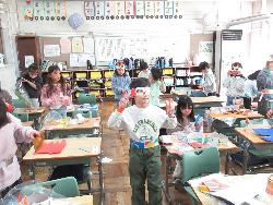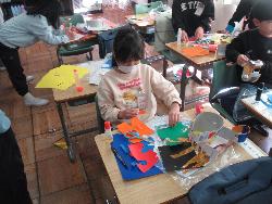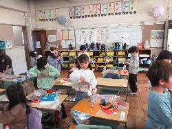 1年生の図工の授業です。「つくって へんしん」という内容に取り組んでいました。厚紙を切って、お面やベルトに変身させていました。お面はカラフルな飾り付けがしてあり、児童の工夫が感じられました。