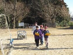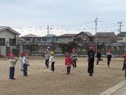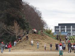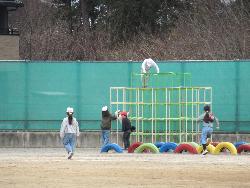 昼休みの校庭は、なわとびをする人、ジャングルジムで遊ぶ人、築山に登る人と、さまざまです。今日は昨日とは一転して寒い日でしたが、子どもは元気いっぱいです。