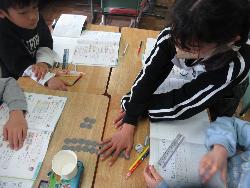 2年生の算数の授業です。「100をこえる数」について学習していました。「100をもとにして、あらわすにはどうしたらよいか」が今日の学習問題です。児童は模型を使ったり、図で表したり、文章で書いたりと、さまざまな方法で、どう表せばよいかを考えていました。