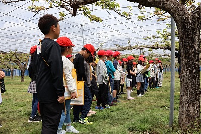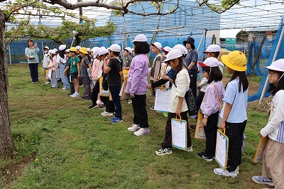 3年生が、今年度1回目の梨園見学にいきました。子どもたちは初めての梨園見学で、興味津々の様子でした。受粉を担うミツバチの話を聞かせていただいたり、接ぎ木の作業の様子を見せていただいたりと、たくさん勉強することができました。次回は5月下旬を予定しています。