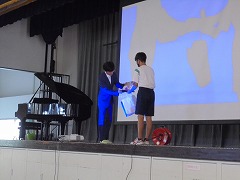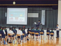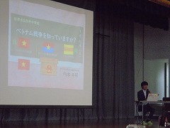 平和教育を継続するために、大阪府河内長野市立西中学校長 内本校長先生をお招きし、「ベトナム戦争を知っていますか?」というタイトルで、講演会を行っていただきました。内本校長先生は、学校経営の傍ら「NPO法人 美しい世界のため」理事長として、2012年にベトナムの元結合双生児グエン・ドクさんが立ち上げた慈善団体「美しい世界のため」の日本支部として活動を行っております。そして、芸術を通じて世界へ平和を発信、障害者介護施設・孤児院等への慰問支援、戦争の悲惨さと平和の尊さを次世代に伝える、文化・芸術・スポーツを通じて友好関係を構築する事業を日本とベトナムを中心に、世界で事業を展開し、その中心となって活動を行っております。白井中において、このような貴重な話を聞くことができ、生徒代表お礼の言葉では、「社会科の授業で少しは聞いたことがあるが、ベトナム戦争について戦争の悲惨さや平和について学ぶことができた」との感想がありました。今後も平和教育についての活動を継続していきます。