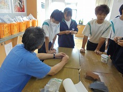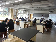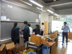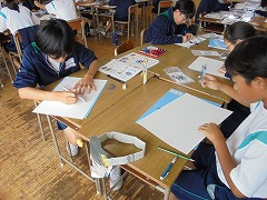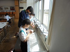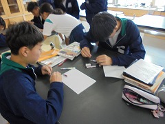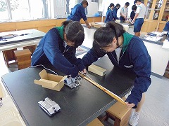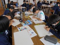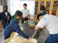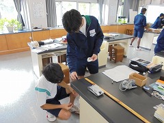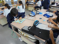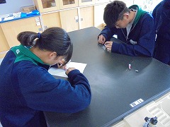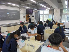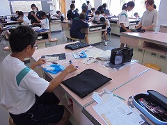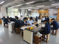 理科室での授業において、2・3年生は、共に実験を行っていました。2年生は、豆電球を灯すために電池と銅線を使用して行っていましたが、明かりが灯ったときに「成功した」という喜びの声が印象的でした。3年生は、物理の実験に近い内容でした。共に先生の指示を聞き、きちんと成功したときの喜びは格別です。美術では、色相環の下準備を行っていました。今後、絵の具で綺麗な色相環が作れると良いです。
