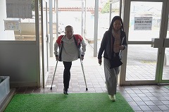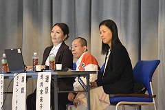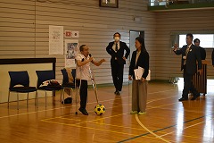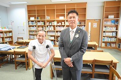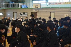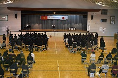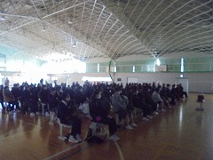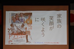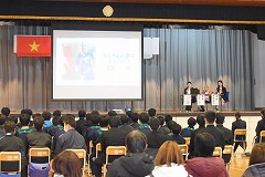 25日(火曜日)にベトナム社会主義国から平和教育講演会のためにグエン・ドクさんが来校しました。朝から小雨のぱらつく中でしたが、半袖姿に笑顔を沢山振りまきながら元気に来校していただきました。同行者として、「ベトちゃん フジとサクラにささぐ愛」映画制作のプロデューサー、通訳の方も来校しました。また、報道関係からは4社ほどの囲み取材を受け、その後、講演会となりました。外部の方としては、学校公開日と重ねたため保護者の方々や学校運営協議会員、報道関係機関等、多数の来校により盛況な講演会となりました。生徒手作りのベトナム・日本の友好として小旗を作り、温かく迎えることができました。講演会では、ベトナム戦争による枯葉剤被害の話や結合双生児として産まれ、亡くなってしまいましたが兄のベトさん対する深い愛情についてや、平和教育活動を推進しているNPO団体の活動、更には、日本から支援を頂いた恩返しとして、双子兄妹の名前を「フジ」と「さくら」さんとした話等、貴重なお話の内容でした。さらに、平和は「対話」を持って図られていくことである事や真の平和について、とても広い視点と深い考えを持っていることに感銘を受けました。生徒からの質問も丁寧に答えていただきました。また、分離手術後にリハビリのために習ったサッカーを生徒と共に実演してくれました。片足と松葉杖で器用にボールをコントロールしパスを出すなど、参加者からは大きな拍手が送られました。午後から次の予定のために学校を離れる時に、廊下から小旗を振って出発を見送ってくれた生徒にドクさんは、「とても素敵な生徒のいる学校ですね」とお話をしてくれました。この機会を通して、平和のあり方や必要について、これからの人生に役立てほしいと願います。