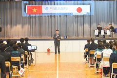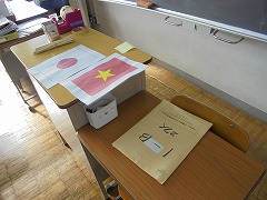 全校道徳として、来校していただくグエン・ドクさんに関する内容を取り上げ、文化の尊重や国を愛する態度、社会への参画という価値項目に触れて考えを深めました。その後、教室に戻って授業の感想や25日(火曜日)にドクさんへの質問を考えたり、日本とベトナムの友好を願いミニ国旗を作成しました。多くの方に参観していただき、平和への願いが伝わることを期待します。