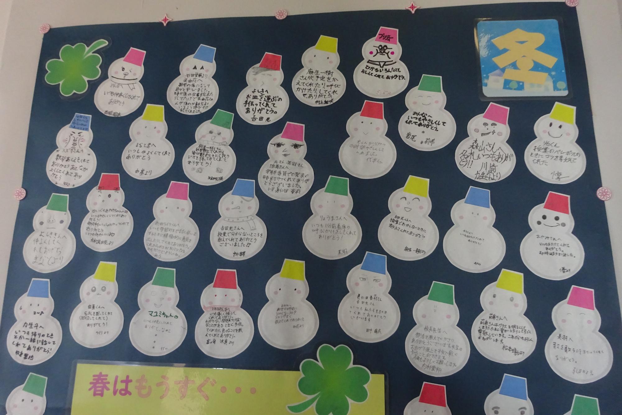 1学年の掲示物の四季が出揃いました。最後の季節、冬は雪だるま達です。いつものように日頃からの友達への感謝が綴られており、読んでいるだけで心が温かくなりました。