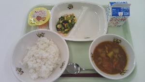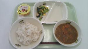 12月の給食では、白井市でとれたほうれんそうを使っています。ほうれんそうは冬に旬を迎え、栄養価も高くなり、甘みが増しておいしくなります。ほうれんそうは緑黄色野菜を代表する野菜で、骨を丈夫にする働きのあるカルシウムや貧血予防に効果的な鉄などの栄養素がたくさん含まれています。今日は、人気メニューのカレーにほうれんそうを加えました。地元でとれた新鮮でおいしい食材を味わいましょう。
