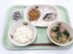 給食初日は新年お祝い献立です。松風焼きは、表面にケシの実やゴマがまぶされている料理です。裏面には何もない状態であることから「隠し事がない正直な生き方ができますように」という意味が込められています。ごぼうは、根が地中深くに入ることから「根気がつく」「土台がしっかりして安定する」などといわれ、縁起の良い食材です。他にも、紅白の白玉餅が入ったお祝い紅白白玉汁や、子孫繁栄の願いが込められた「だいだい」を使ったババロアのメニューにしました。新たな年のみなさんの健康と幸せを願った献立です。