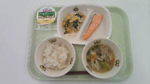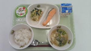 学校給食はお弁当を持ってこられない子供のために、明治22年に始まりました。今日は学校給食が始まった明治22年の給食「おむすび、塩鮭、菜の漬物」をアレンジした献立です。