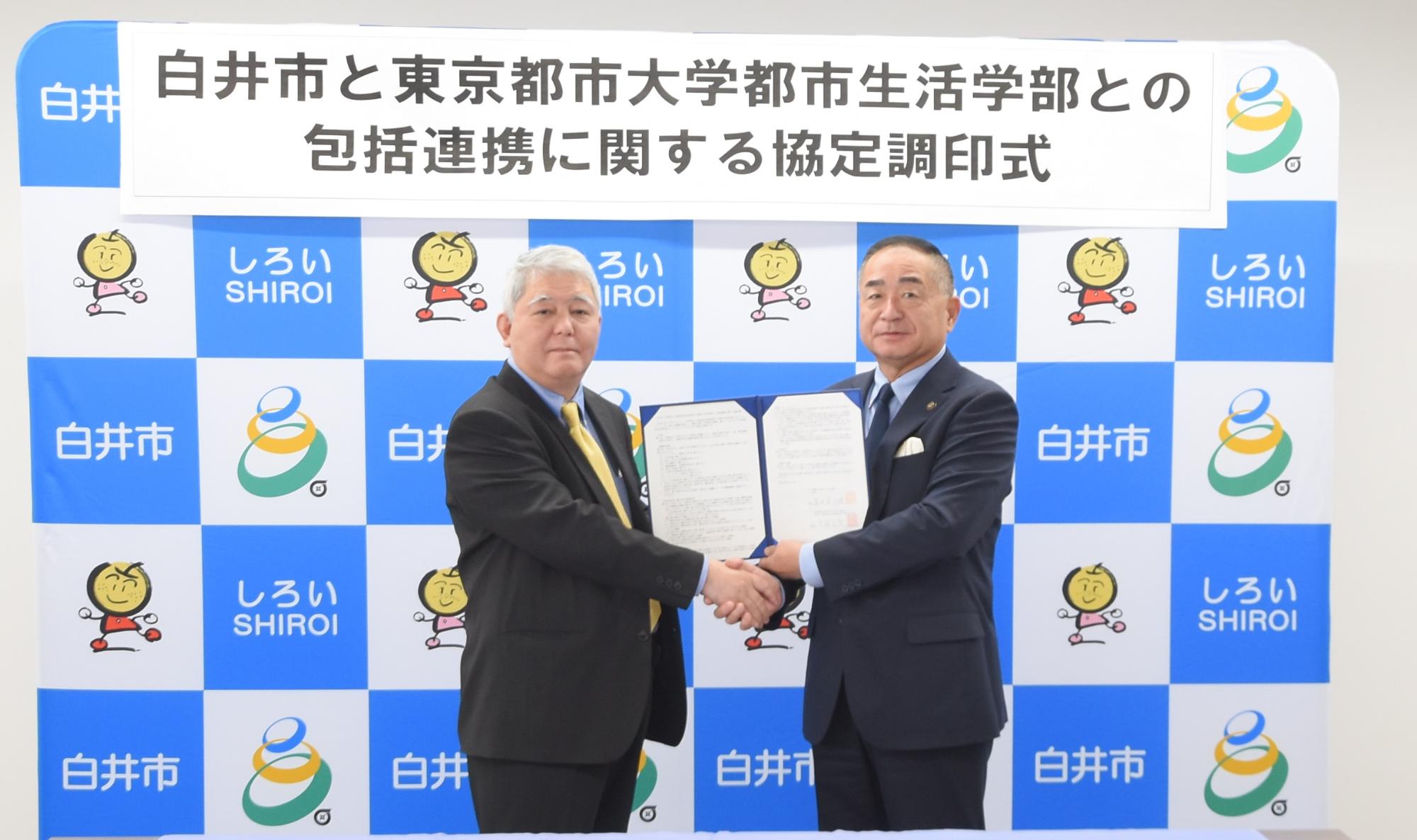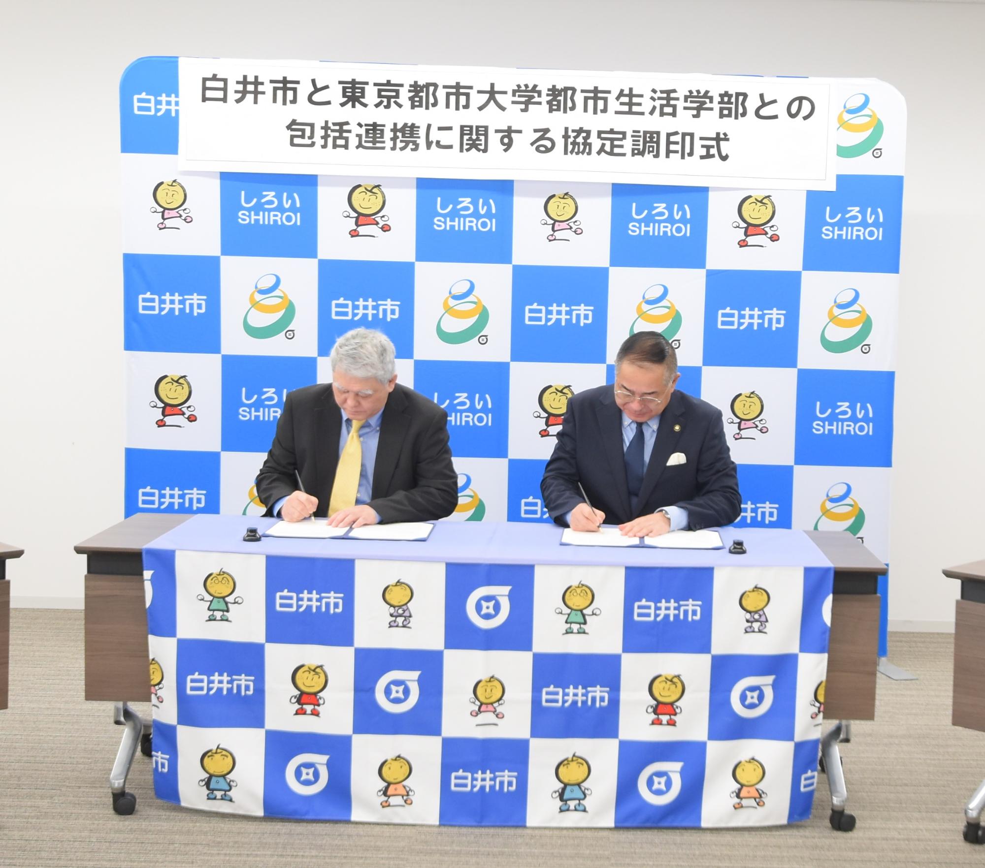 白井市と都市大・都市生活学部は、包括的な連携のもと、広範な分野で知的・人物・物的資源を相互に活用し、地域社会の持続的発展に寄与することを目的とする。