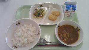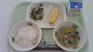 12月の給食では、白井市でとれたほうれんそうを使っています。ほうれんそうは冬に旬を迎え、栄養価も高くなり、甘みが増しておいしくなります。ほうれんそうは緑黄色野菜を代表する野菜で、骨を丈夫にする働きのあるカルシウムや貧血予防に効果的な鉄などの栄養素がたくさん含まれています。今日は、人気メニューのカレーにほうれんそうを加えました。地元でとれた新鮮でおいしい食材を味わいましょう。