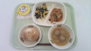 17日から中学校3年生は公立高校の入試です。今日は「受験生応援献立」として脳の活性化を促すため、「かみかみ献立」にもなっています。また、『白菜と白玉のスープ』の白玉もちから「成績も気持ちも上に伸びる」、『きんぴら豚丼の具』は丼ものであることやごぼうが入っていることから、「どんどん問題解けるよ、ごぼう抜き」、『おかかサラダ』に入っている鰹節から「勝つ」、い~予感とかけて『いよかんゼリー』の給食にしました。